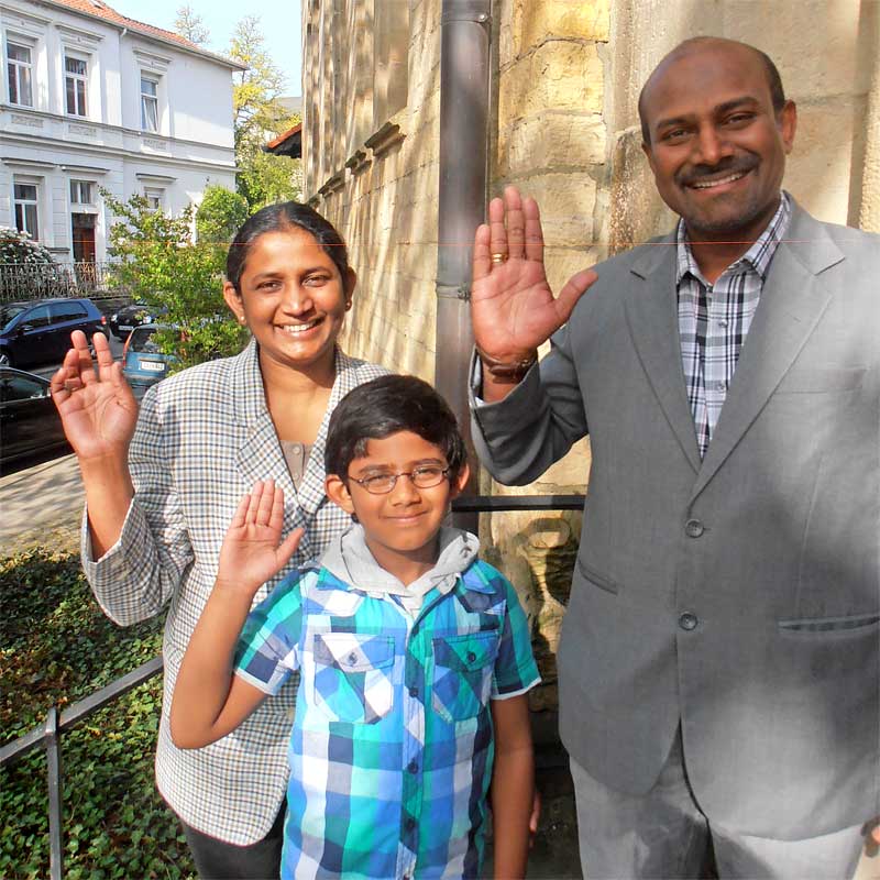 Pastor Sugirtharaj Thiruchelvanesam ist Pfarrer der Ev.-methodistischen Kirche in Sri Lanka, einer der Partnerkirchen der Vereinten Evangelischen Mission (VEM). Er wurde 2010 auf die Stelle eines Ökumenischen Mitarbeiters in unserer Ev.-ref. Kirche berufen, speziell für die Jugendkirche in Osnabrück. Als ich ihn mit seiner Ehefrau Milcah und seinem Sohn Sheken 2011 am Flughafen Düsseldorf abholte, um sie für einen einjährigen Sprachkurs zum Ökumenischen Studienwerk nach Bochum zu bringen, begegneten mir überaus herzliche Menschen mit viel Offenheit für die künftigen Aufgaben in Deutschland. Nur Sheken war überhaupt nicht einverstanden mit der ihm ungewohnten Kindersitz- und Anschnallpflicht in Deutschland…