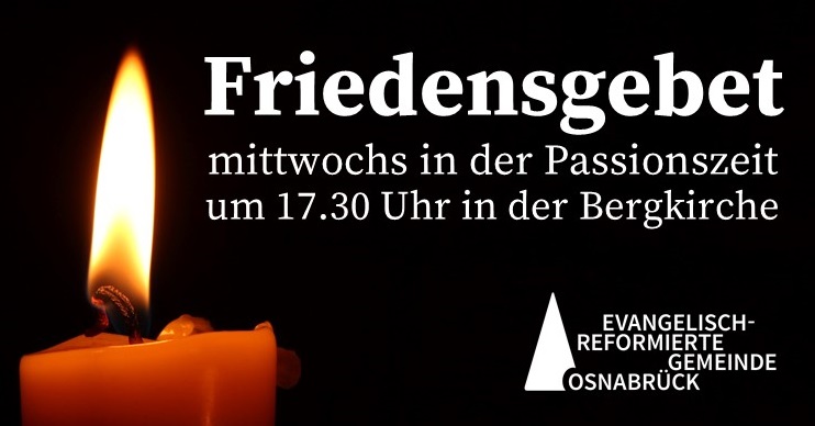 m heutigen Freitag finden in vielen Kirchen Friedensgebete um 18 Uhr statt. Zu diesen und zum ökum. Friedensgebet am Samstag um 11.30 Uhr in St. Marien mit anschl. Schweigemarsch durch die Stadt laden wir herzlich mit ein. In der Passionszeit laden wir jeden Mittwoch um 17.30 Uhr zu einem kurzen Friedensgebet in der Bergkirche ein.